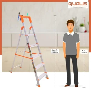 Qualis Hybrid 5 Step Ladder with Tool Tray is a sturdy, lightweight, and multipurpose ladder designed for home and professional use. It features a strong aluminum frame, wide anti-slip steps, and a handy tool tray for easy access to your essentials.