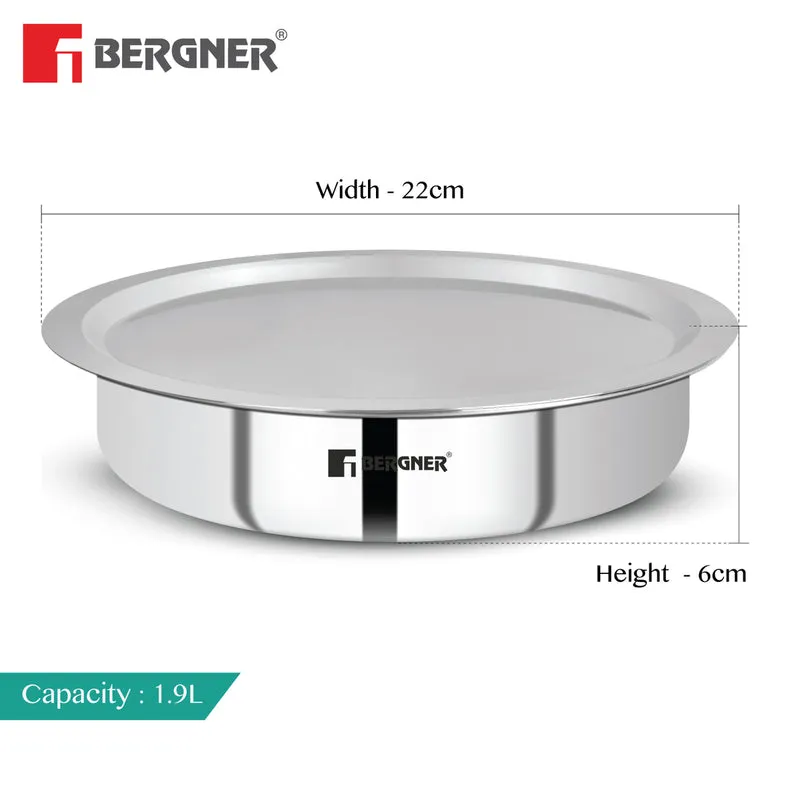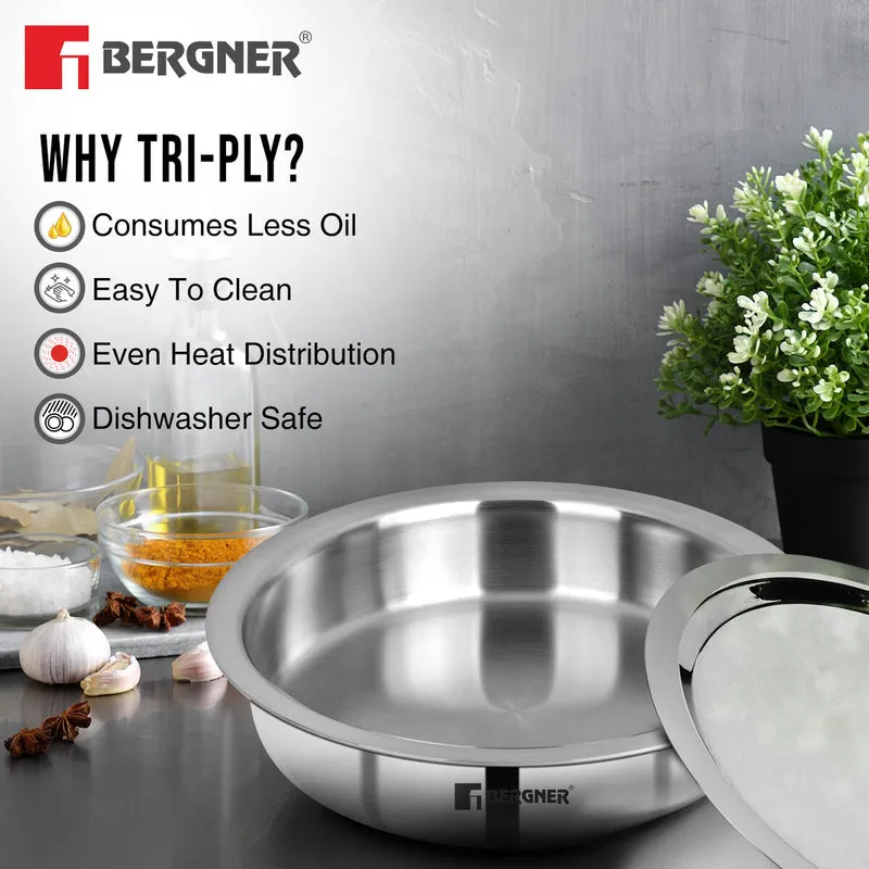 Cook smarter and healthier with the Bergner Argent Tri-Ply Stainless Steel Lagdi 22cm (1.9 L). Built with advanced tri-ply construction, this cookware features three layers – food-grade stainless steel inside for safe cooking, a thick aluminium core for uniform heat distribution, and an induction-compatible stainless-steel outer layer for versatile use.