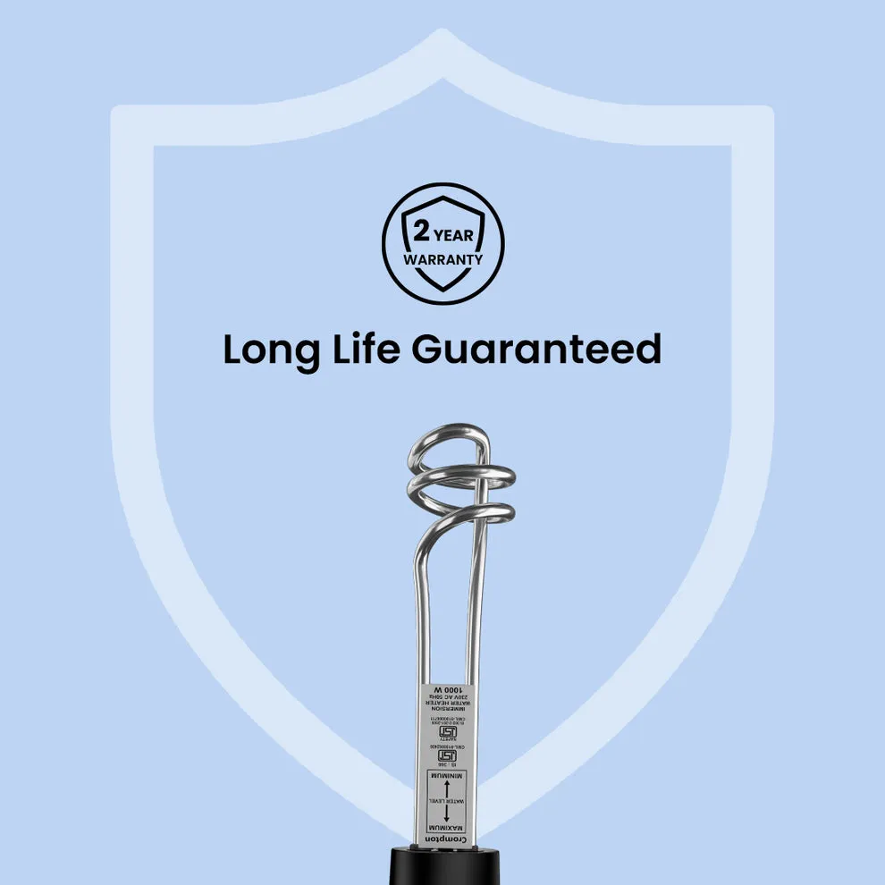 The Crompton AIMR SP15A 1500W Immersion Water Heater is designed to deliver quick, efficient, and safe heating for your daily needs. With IP68 waterproof protection, it guarantees safety from electric shocks and enhances user confidence. The high-performance 1500-watt copper heating element ensures rapid water heating, while the anti-corrosive and rust-resistant body ensures long-lasting durability.
