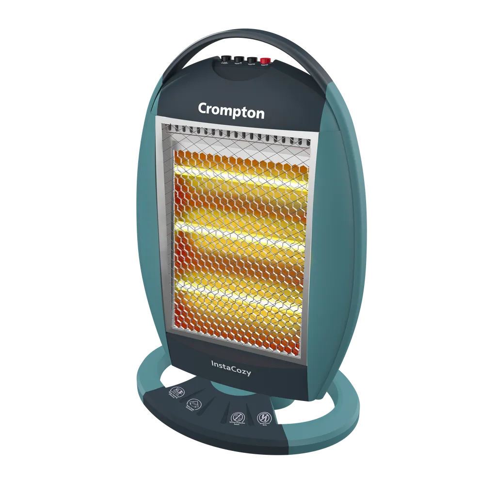 Crompton Insta Cozy 1200W Halogen Room Heater delivers quick, efficient heating with 3 heat settings, tip-over safety, and energy-saving halogen technology.
