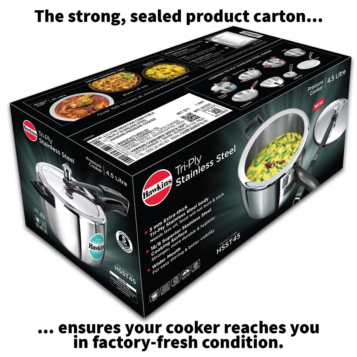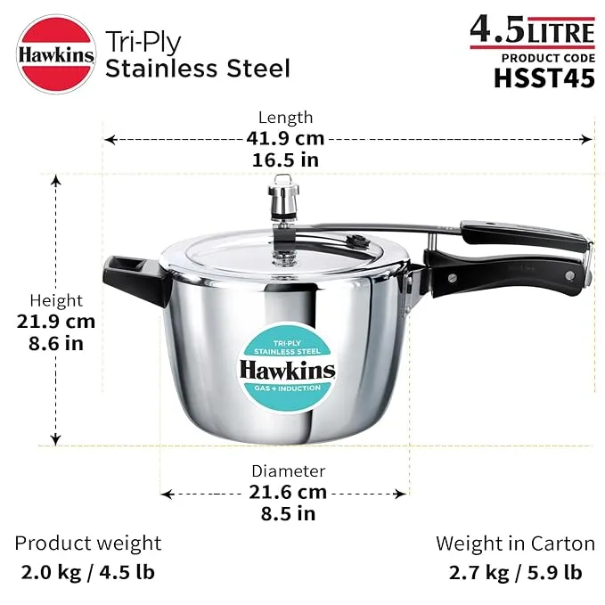 Cook smart and safely with the Hawkins Triply Stainless Steel Pressure Cooker 4.5L Inner Lid (HSST45). Built with advanced triply technology for even heating and energy efficiency, it’s ideal for medium to large families. Suitable for both gas and induction cooktops.