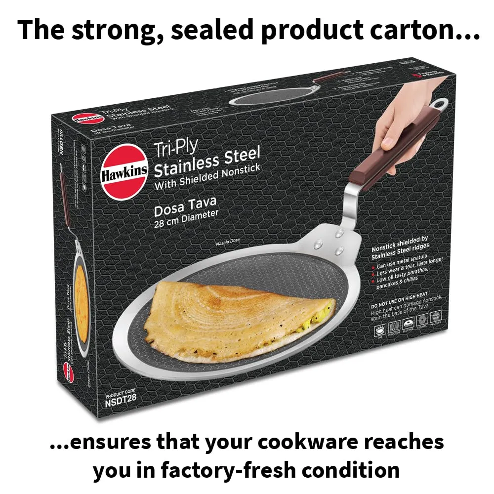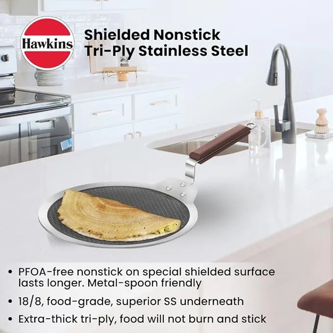 Hawkins Triply Stainless Steel Shielded Nonstick 28cm Dosa Tawa features fast heating, even cooking and a durable nonstick surface protected by steel layers. Comes with a sturdy cool-touch wooden handle for easy, safe cooking. Perfect for crispy dosas, rotis, uttapam and parathas.