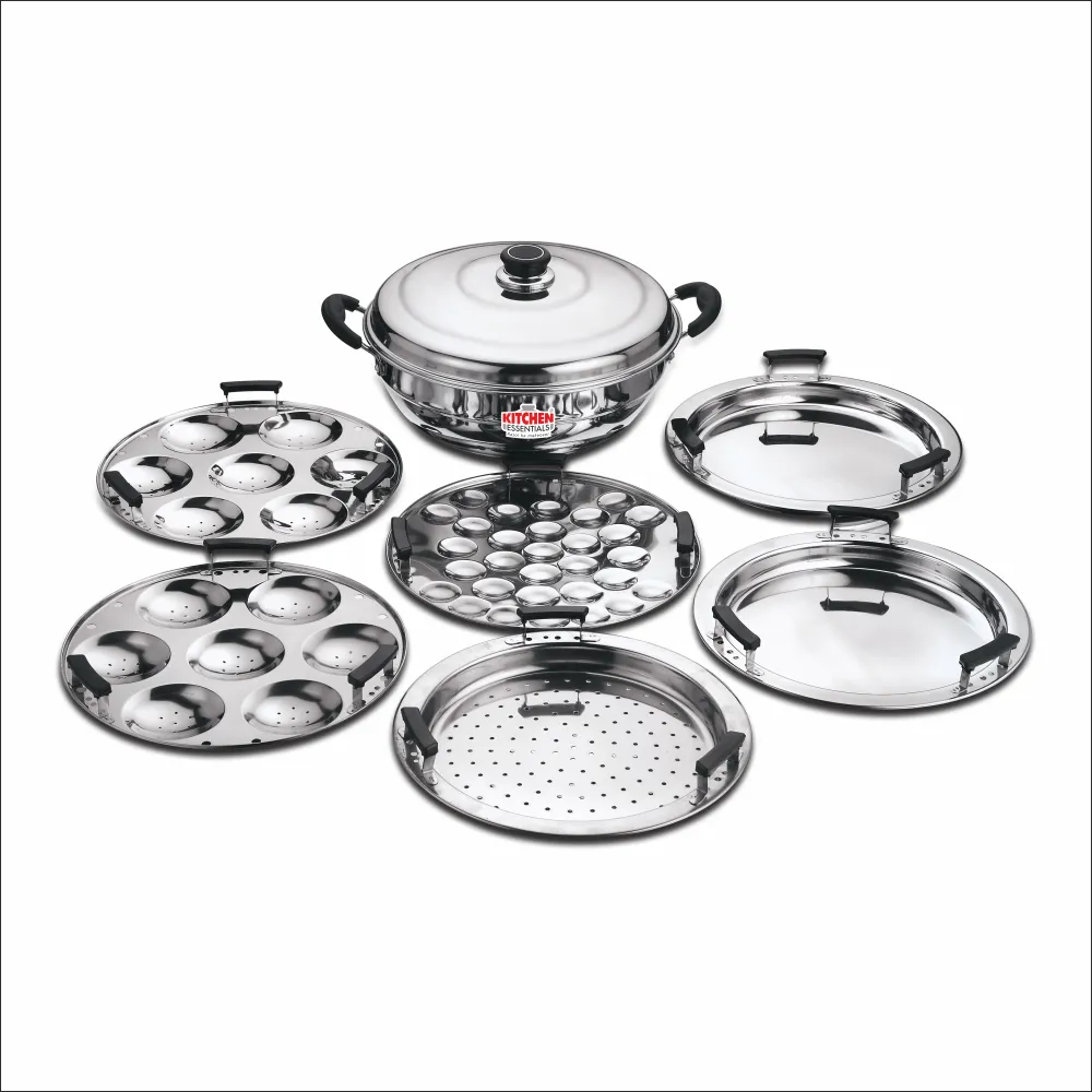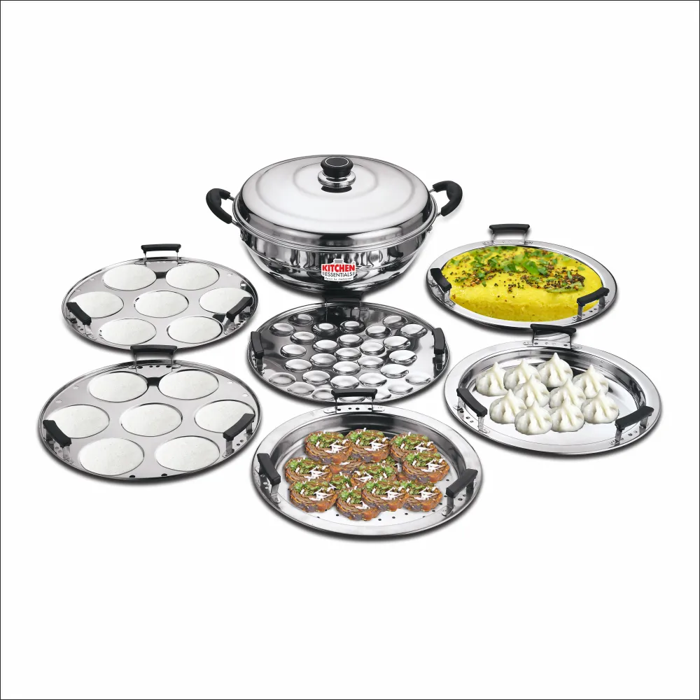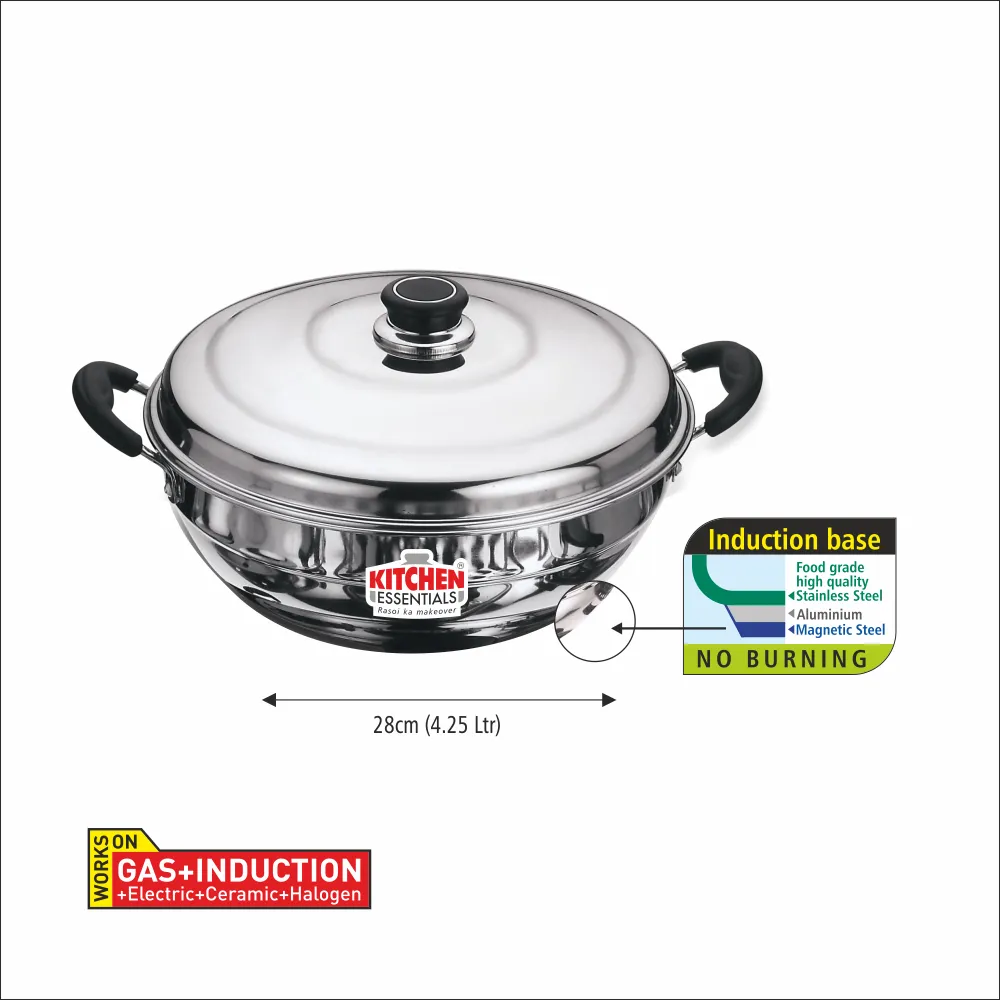Kitchen Essential Stainless Steel Multi Kadai (28cm) features an induction-friendly base and comes with 6 versatile plates for idli, mini idli, dhokla, patra, momos, and modak—ideal for steaming and multi-purpose cooking.