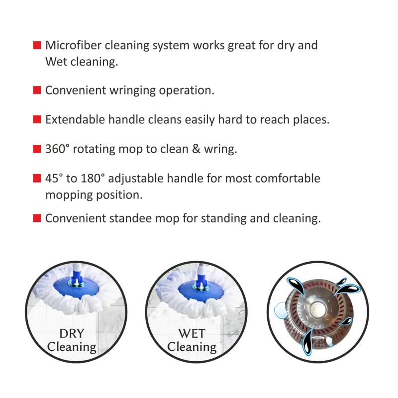 he Kleeno Super Clean Spin Mop Steel Jali with 1 Extra Refill brings a new level of convenience and efficiency to your home cleaning routine. Its 360° rotating microfiber mop head easily reaches tight corners, under furniture, and along wall edges for a thorough clean every time.