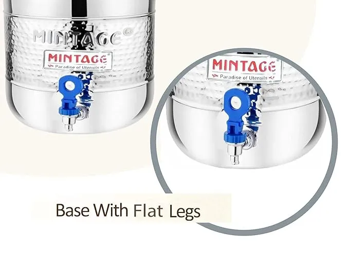 The Mintage Stainless Steel Hammered Matka with Tap – 25 No. (23 Litre) is designed for those who need stylish, safe, and large-volume water storage. Made from premium-quality stainless steel, it ensures long-lasting durability, shine, and rust resistance.