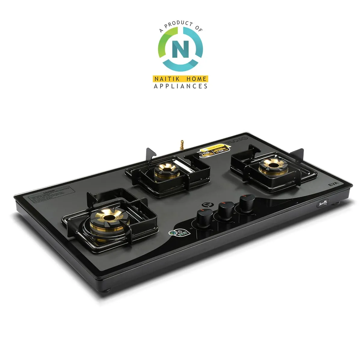 Naitik Gas Stove 3 Burner Eva Next 080 Toughened Glass Top | Glass Top 3Br Gas Stove | Manual Ignition
