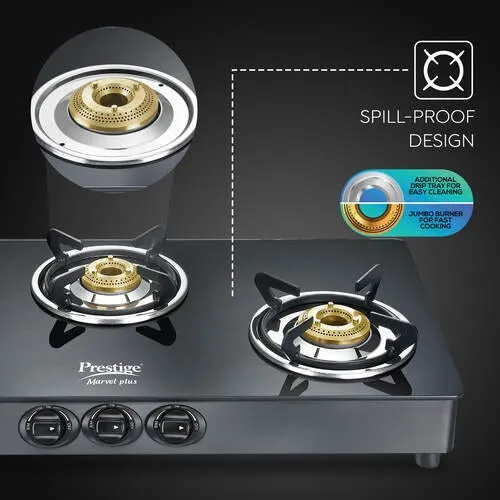 The spill-proof design keeps your kitchen clean, while ergonomic knobs provide smooth control for precise flame adjustment. With sturdy pan supports and an ISI-certified build, the Prestige Marvel Plus GTM03 delivers both safety and performance, making it the perfect blend of innovation and reliability.