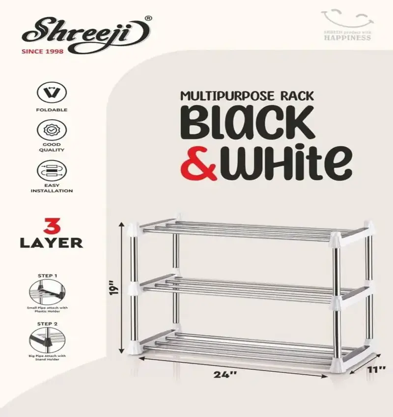 The Shreeji Black & White 3 Layer Multipurpose Rack is a durable and space-saving organizer made from premium plastic. Ideal for use as a shoe rack, storage stand, or utility shelf, it helps keep your home neat and tidy. Lightweight, sturdy, and easy to assemble for everyday convenience.