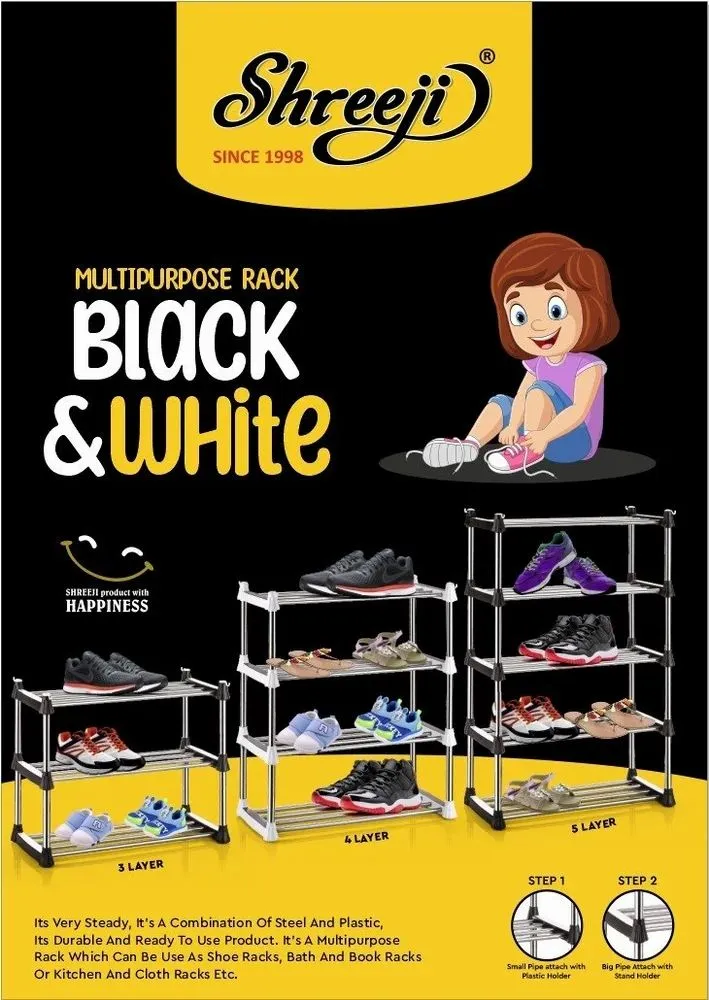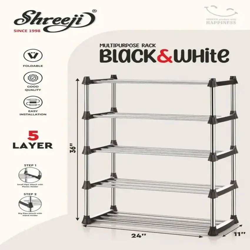 The Shreeji Black & White 5 Layer Multipurpose Rack is a strong, stylish, and practical storage solution for every home. Made from high-quality plastic, it features five spacious layers to neatly organize shoes, books, kitchen items, or household essentials. Lightweight, sturdy, and easy to assemble.