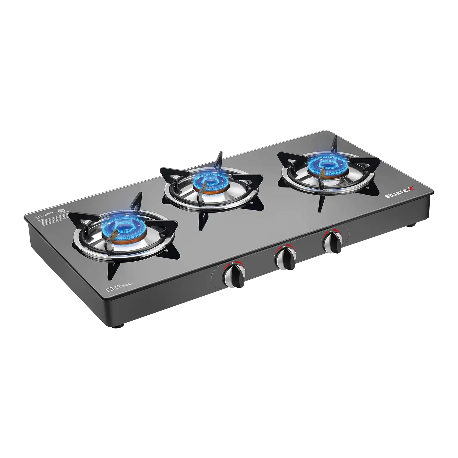 Sujata Standard 3 Burner Glass Top Gas Stove With SABAF Italian Valve | Manual | Glass Top Gas Stove